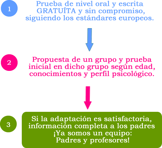 Cuando un alumno/a nos visita por primera vez intentamos que incluso la prueba inicial sin compromiso sea distinta, que disfrute, que establezca una conexión inicial con nosotros, que se lleve a casa esa experiencia.Nuestro deseo es que se sientan cómodos, felices, que se adapten lo mejor posible y que su nivel de aprendizaje esté acorde con sus capacidades y posibilidades, y que el carácter de su futuro grupo sea el más adecuado.