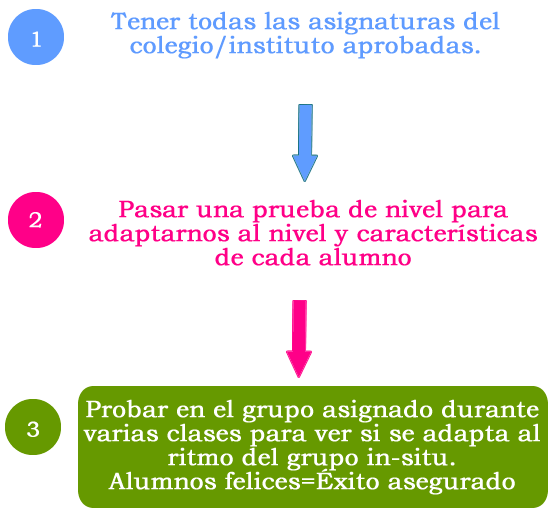 Cuando un alumno de más de 8 años quiere formalizar su matrícula con nosotros,y al terminar cada trimestre le pedimos siempre sus últimas notas obtenidas y que todas sus asignaturas estén aprobadas.Es muy sencillo: Creemos en el éxito a través del mérito. Y la prioridad de los alumnos es su futuro. Estaríamos engañando a nuestros clientes y a nosotros mismos si aceptáramos que nuestros alumnos no se esforzaran al máximo.